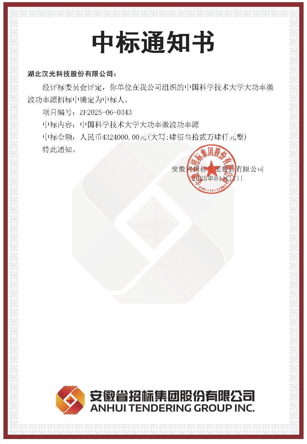 近日,公司收到安徽省招標(biāo)集團(tuán)股份有限公司發(fā)來(lái)的中標(biāo)通知書(shū),公司成功中標(biāo)中國(guó)科學(xué)技術(shù)大學(xué)4套大功率微波功率源,中標(biāo)金額總計(jì)432.4萬(wàn)元。