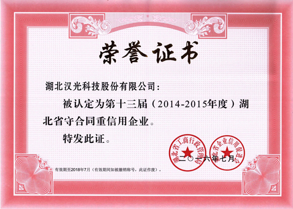 2016年7月19日,我公司榮獲第十三屆(2014-2015年度)湖北省“守合同重信用”企業(yè)榮譽(yù)稱號(hào)。該評(píng)選活動(dòng)由省工商局、省企業(yè)信用促進(jìn)會(huì)舉辦。